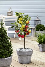 Exklusiv zum BakkerJubiläum kommt das neue Bäumchen Apfeltrio mit gleich drei verschiedenen Apfelsorten an einem Stamm auf den Gartenmarkt. Der Fruchtdreiklang besteht aus roten ‘Jonagored’, gelbgrünen ‘Golden Delicious’ und rotgelben ‘Elstar’. Dies ergibt nicht nur eine schöne Farbkombination, sondern bietet knackigen Genuss in drei Geschmacksrichtungen. Im Kübel erreicht der hübsche Apfelbaum eine Höhe von etwa 125 Zentimeter und eignet sich daher optimal für Terrasse, Balkon und kleinere Gärten. Da sich die drei Apfelsorten gegenseitig bestäuben, kann der Baum eigenständig Früchte produzieren – und benötigt keine anderen Obstbäume in seiner Nähe. ApfelTrio gibt es ab März 2015 bei Bakker (16,95 € pro Stück).