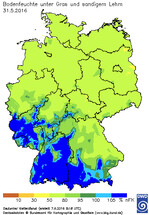 Der Deutsche Wetterdienst DWD gibt einen Überblick über das Wetter von März bis Mai 2016. Dabei zeigt sich auf einer Abbildung zur Bodenfeuchte, dass die heftigen Niederschläge zum Monatsende zumindest im Südwesten Deutschlands zu wassergesättigten Böden führten. In den restlichen Landesteilen lagen die Werte meist zwischen 50 und 80 % nFK.