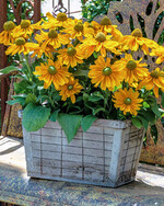 Rudbeckia hirta 'Amarillo Gold'(Züchter: Benary) Diese neueste preisgekrönte Rudbeckia hirta aus Samenvermehrung zeigt eine Fülle großer Korbblüten mit grünem Zentrum umsäumt mit goldenen Zungenblüten, die zur Spitze hin gelb leuchten. Die 13 bis 15 cm großen Blüten auf kurzen Stielen machen diesen kompakten reichblühenden Sonnenhut zu einer idealen Pflanze für Kübel und Beet. 'Amarillo Gold' gelangt im Frühsommer sehr früh zur Blüte und blüht bis zu den ersten Frösten. Sie ist sehr uniform, sowohl was den Wuchs als auch die Farbe betrifft. Sie beeindruckt so über einen langen Zeitraum mit ihrer intensiven Blütenfarbe. Ihre Blüten waren größer als die der Vergleichssorten in der Sichtung. Die Jury war beeindruckt von der „Fülle attraktiver Blüten auf kürzeren, kräftigen Stielen“. Ab der Frühjahrssaison 2021 sind diese Neuheiten in den Sortimenten der Gärtnereien und Gartencenter zu finden. |