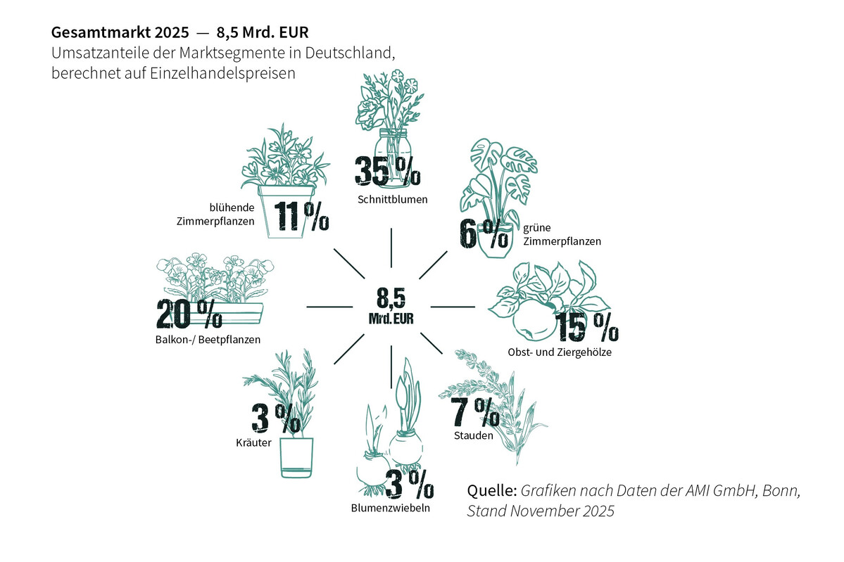 Nach Schätzungen der Agrarmarkt Informations-Gesellschaft mbH (AMI) auf Basis der ersten drei Quartale 2025 schrumpfte der Markt für Blumen & Zierpflanzen im Jahr 2025 auf ein Niveau von 8,5 Mrd. Euro (zu Einzelhandelspreisen).