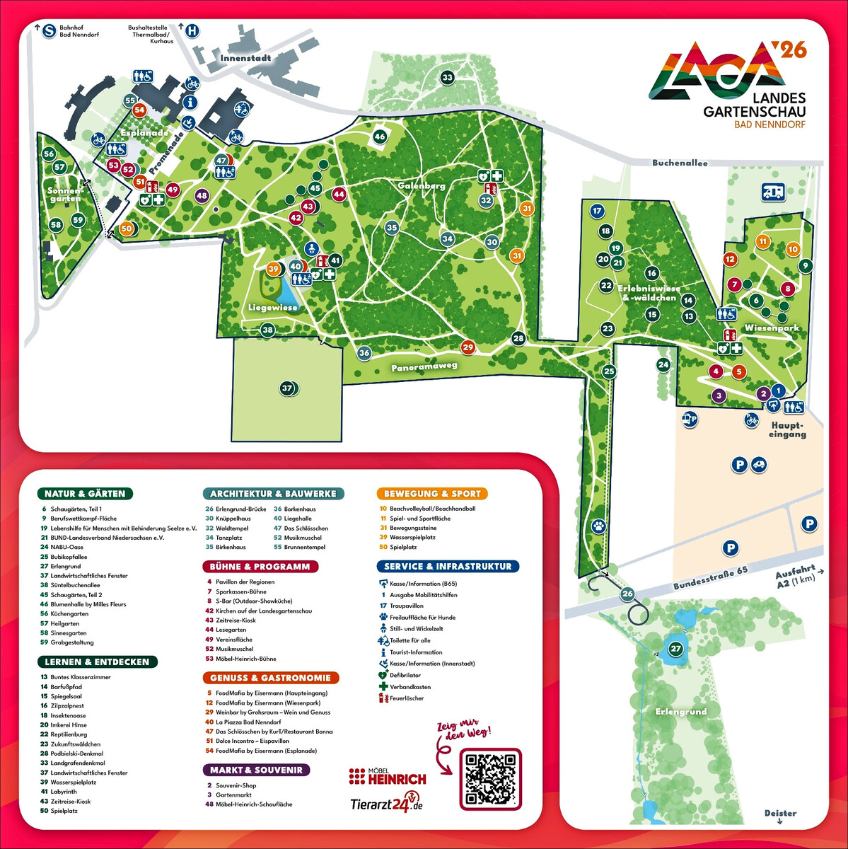1Die Landesgartenschau in Bad Nenndorf ist geprägt von der historischen Parkanlage der Bäderstadt. Die Neuplanungen zur 38 ha umfassenden LGS betreffen drei Bereiche: den sanierten Kurpark mit alterwürdigen Bäumen, den seit den 1980er-Jahren nicht mehr gepflegten Landschaftspark auf dem bewaldeten Galenberg und den Wiesenpark.