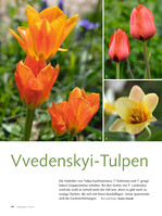 Die Hybriden von Tulipa kaufmanniana, T. fosteriana und T. greigii haben Gruppenstatus erhalten. Bei den Sorten von T. vvedenskyi wird das wohl so schnell nicht der Fall sein, denn es gibt noch zu wenige Züchter, die sich mit ihnen beschäftigen. Umso spannender sind die Gartenerfahrungen.