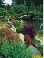 Ein landschaftlich gestalteter Garten in den USA fügt sich mit terrassierten Wasserflächen harmonisch in die Landschaft ein. Die von Sträuchern dominierte Bepflanzung sorgt zu jeder Jahreszeit für ein lebhaftes Farbenspiel.