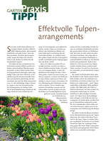 Wir haben für die verschiedenen Gartenbereiche unseres 4000 m² großen Geländes unterschiedliche Pflanzkonzepte entwickelt. In dem 250 m² großen Beet im Eingangsbereich überragen späte langstielige Tulpen der Sorte 'Menton' in Einzelpflanzung die heranwachsenden Stauden und kaschieren gleichzeitig das Narzissenlaub, das nach der Blüte auswachsen muss. Je 100 Lilienblütige Tulpen 'Mariette' sorgen in den vier Kompartimenten des Kräutergartens für kräftige Farbe. Durch die Einzelpflanzung entsteht ein flächiger Eindruck und verstärkt die Wirkung. Im Gemüsegarten und anderen Bereichen werden Tulpen so in Reihen gepflanzt, dass farbintensive Bänder zwischen Mitte April und Anfang Mai die Gartenteile beleben. Im weißen Garten, dem gelben Hüge l...