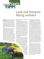Falllaub lässt sich im Herbst sinnvoll zur Flächenkompostierung verwerten. Dadurch bleibt der Boden bedeckt, es kommt bei Regen nicht zu Erdabtrag. Für die Flächenkompostierung breitet man Laub auf Gemüse- oder Blumenbeeten beziehungsweise unter Baumscheiben aus. Die Schicht muss schon 10 bis 15 cm dick sein. Das Material wird mit dem Sauzahn oder dem Krail nur flach mit der obersten Bodenkrume vermischt. Ein wenig fertigen Kompost oder Erde streut man auf, damit das leichte trockene Laub nicht fortgeweht wird und um Organismen einzubringen, besorgen. Das Laub verrottet während der folgenden Monate.