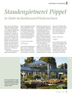 Schon von der Straße aus sind die großen Glasdächer der Staudengärtnerei zu entdecken. Bis Doris und Eckehard Pöppel 1986 das Grundstück am Ortsrand von Seckenhausen erwarben, hatten sie in der Nähe auf einem gepachteten Grundstück eine Gärtnerei, die vor allem Großhändler und Wiederverkäufer bediente. Mit dem Umzug veränderte sich die Struktur des Betriebes, denn die neue Lage direkt an der Hauptstraße war besonders für Publikumsverkehr geeignet. 1981 machte sich Eckehard Pöppel als Staudengärtnermeister selbstständig und hatte schon im Folgejahr die erste Auszubildende. Da er im Bereich Großhandel gelernt hatte, verfolgte er diese Richtung weiter. Die Pflanzenvermehrung für den Großhandel war ein guter Einstieg für den Aufbau der...