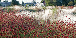 Durch die Einführung nordamerikanischer und ostasiatischer Wiesenknöpfe, der leichten Hybridisierung der Arten untereinander sowie den inzwischen zahlreich gewonnenen Auslesen hat sich das Sanguisorba-Angebot binnen weniger Jahre vervielfacht. Sieht man einmal von unproblematischen und gut standfesten Sanguisorba canaden-sis mit cremeweißen Blüten ab, sind die Wiesenknopf-Blütenstände selten aufrecht. Es sind eher Köpfchen oder überhängende Ähren von Weiß über Rosa bis hin zu sehr dunklem Rot. Derartige Blütenstände fügen sich gleichermaßen gut in Arrangements mit kräftigen, strukturstarken Stauden wie auch in Kombinationen mit noch zarteren Pflanzengeschöpfen ein.