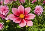 Die Einfachblühende Dahlie 'Héroïne' wurde von 19 000 Besucherinnen und Besuchern zur "Mainau- Dahlienkönigin 2018" gekürt. Die Neuheit des französischen Züchters Ernest Turc wird etwa 80 bis 100 cm hoch, die Blüten weisen, ausgehend vom gelben Zentrum, einen Farbverlauf von dunklem Pink hin zu einem zartem Rosaton auf und erreichen einen Durchmesser von etwa 12 cm.