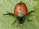 Seit etwa 100 Jahren ist der ursprünglich aus Asien stammende Japankäfer (Popillia japonica) auf dem Vormarsch. Der unserem heimischen Junioder Gartenlaubkäfer (Phyllopertha horticola) ähnelnde Schädling hat fünf weiße Haarbüschel auf der Seite und zwei am letzten Abdominalsegment. Ausgewachsene Käfer sind etwa 1 cm lang und haben ein metallisch-grünes Halsschild.
