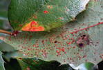Befall mit Rostpilzen: Im Frühsommer werden auf den Blättern zahlreiche kleine, runde rote, gelbe oder rötlich gelbe Flecken sichtbar. In deren Bereich sind blattunterseits anfangs gelbliche, später braune stäubende pustelförmige Sporenlager zu erkennen. Der Rostpilz Cumminsiella mirabilissima (Syn. Cumminsiella sanguinea, Uropyxis sanguinea) überwintert an den Blättern vor allem mit seinen im Herbst in den braunen Sporenlagern gebildeten Wintersporen. Die Krankheit wird zwar oft an Mahonien beobachtet, doch kann sie höchstens örtlich und zeitweilig so ernst werden, dass man sie gezielt bekämpfen muss. In diesem Fall ist im Herbst ein Rückschnitt von stark befallenen Pflanzenteilen empfehlenswert. Im Frühjahr können zusätzliche...