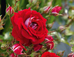 Die dichtbuschige, kompakt aufrechte Patiorose (50 cm hoch, 40 cm breit) zeigt eine exzellente Blattgesundheit und ergänzt die Lilliputs-Kollektion von Kordes Rosen. Die gefüllten Blüten (4 bis 5 cm) in leuchtendem Rot, außen weiß gezeichnet, stehen in dichten Dolden; öfterblühend, kein Duft, bildet Hagebutten. Passend für kleine Gärten und Kübel. (Kordes Rosen)