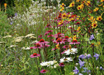 Im Hochsommer und Herbst entwickelt das Schotterbeet eine große Farbenpracht. Die barocke Üppigkeit mag nicht jedermanns Sache sein, und mit einer geringeren Anzahl verschiedener Stauden würde die Pflanzung vielleicht eleganter und "moderner" wirken. Bei der Planung war die Vielfalt jedoch wichtig, denn sie ermöglicht eine Choreografie von Blatt- und Blühhöhepunkten rund ums Jahr.