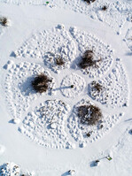 Etwas überdimensioniert wirkt es zwar, aber man könnte meinen, es sei ein gezuckertes Gebäckstück für den Gabentisch. Tatsächlich liegt hier unter einer Schneedecke verborgen der kreisrunde Teil des sogenannten „Körperbeetes“ im Naturgarten von Alb-Gold in Trochtelfingen.