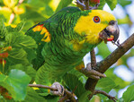 Seit 1984 hat sich in Stuttgarts Parkanlagen aus entflogenen oder frei gelassenen Heimvögeln eine kleine Population Gelbkopfamazonen etabliert. Die rund 60 Exemplare sind teilweise mit Blaustirnamazonen hybridisiert, wie diese, die sich an frischen Maulbeeren gütlich tut.